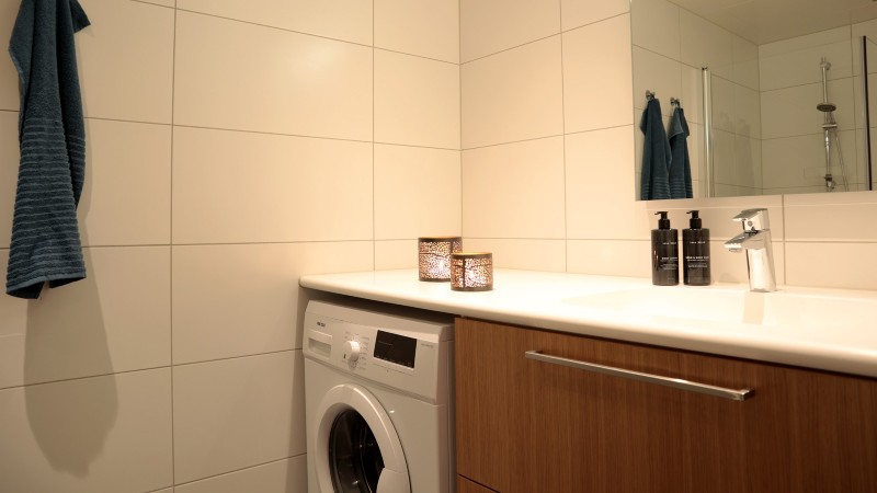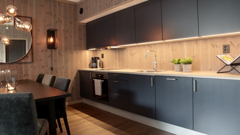 I köket finns bland annat: spis, kylskåp med frys, diskmaskin, vattenkokare, kaffebryggare.