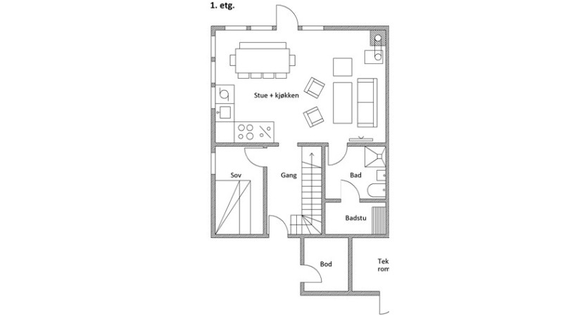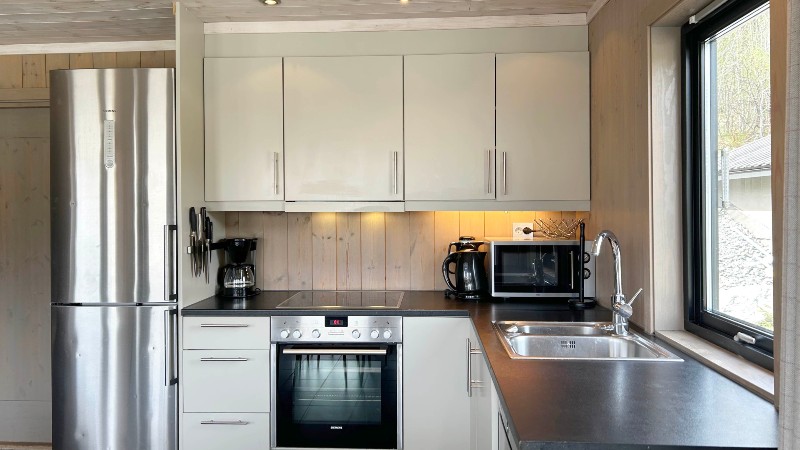 Kök: I köket finns bland annat: kylskåp med frys, spis, mikro, diskmaskin.